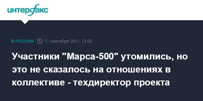 Москва. 11 сентября. INTERFAX.RU - Участники эксперимента по имитации полета на Красную планету "Марс-500" утомились однообразной жизнью в изоляции, но сохранили хорошие отношения между собой и не высказывают желания покинуть проект, сообщил "Интерфаксу-АВН" его технический директор Евгений Демин. "Монотонность существования в течение 464 суток, конечно, дает о себе знать. Изолированность от внешнего мира, ежедневная рутина, повторяющиеся исследования не вдохновляют экипаж", - сказал он.