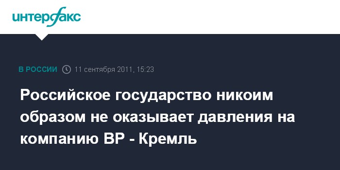 Москва. 11 сентября. INTERFAX.RU - Кремль заявляет, что российские власти не пытаются оказывать давления на британскую компанию BP. "Это вопрос, лежащий исключительно в коммерческой плоскости. Никакого элемента государства здесь вообще нет", - сказал журналистам помощник президента РФ Сергей Приходько. "Корни этой ситуации - не в политической, а в экономической плоскости. Государство здесь ни под каким углом не участвует", - подчеркнул он.