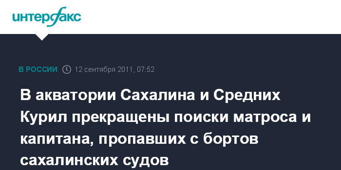 Южно-Сахалинск. 12 сентября. ИНТЕРФАКС-ДАЛЬНИЙ ВОСТОК - В южной части Татарского пролива прекращены поиски матроса, пропавшего с борта сахалинского траулера СРТМС "Восток-3", сообщили агентству "Интерфакс - Дальний Восток" в морском спасательном подцентре (МСПЦ) "Южно-Сахалинск".