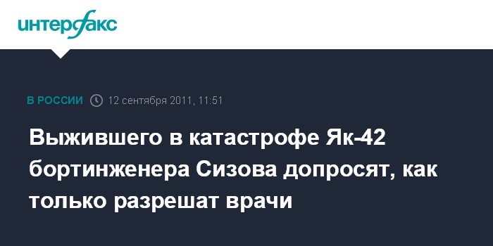 Москва. 12 сентября. INTERFAX.RU - Бортинженер экипажа Як-42 Александр Сизов, выживший в авиакатастрофе, будет допрошен следователями в рамках уголовного дела о крушении самолета под Ярославлем 7 сентября, когда это позволит состояние его здоровья.