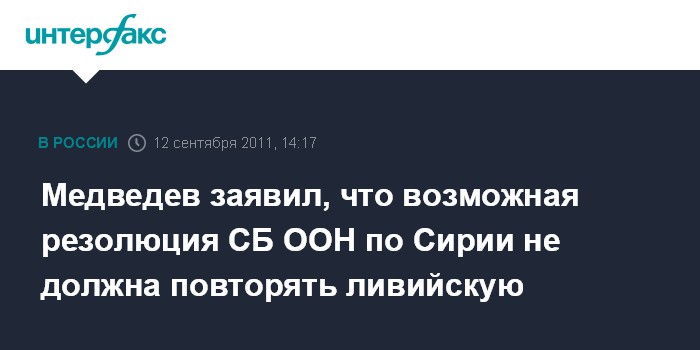 Москва. 12 сентября. INTERFAX.RU - Резолюция СБ ООН по Сирии должна быть жесткой, но не должна предусматривать автоматического введения санкций в отношении этой страны и быть подобием резолюции СБ ООН 1973 по Ливии, заявил президент РФ Дмитрий Медведев.