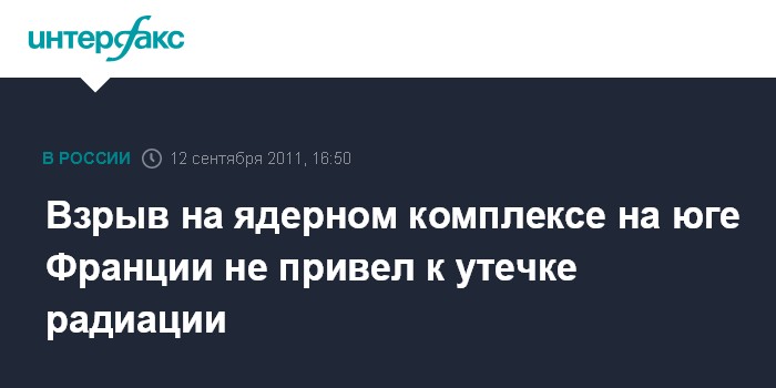 Париж. 12 сентября. INTERFAX.RU - Французские эксперты пока не зафиксировали утечку радиации в результате взрыва на территории предприятия по переработке ядерных отходов, сообщает национальное агентство по ядерной безопасности страны.