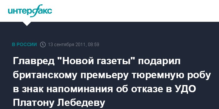 Москва. 13 сентября. INTERFAX.RU - Главный редактор "Новой газеты" Дмитрий Муратов вручил в подарок премьеру Великобритании Дэвиду Кэмерону тюремную робу, из-за пропажи которой суд не удовлетворил ходатайство об условно-досрочном освобождении бывшего руководителя МФО "МЕНАТЕП" Платона Лебедева.