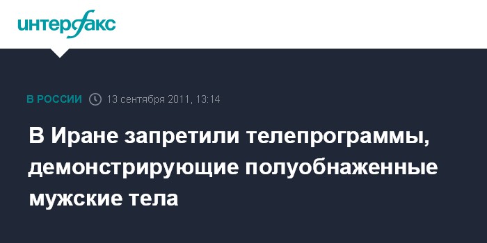 Тегеран. 13 сентября. INTERFAX.RU - Иранские власти ввели запрет на трансляцию телевизионных программ, на которых изображаются мужчины в полуобнаженным виде, сообщают местные СМИ.