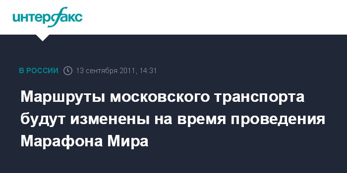 Москва. 13 сентября. INTERFAX.RU - Двенадцать маршрутов общественного транспорта будут изменены в воскресенье в связи с проведением ХХХI Московского Международного Марафона Мира, сообщили "Интерфаксу" в пресс-службе ГУП "Мосгортанс" во вторник.