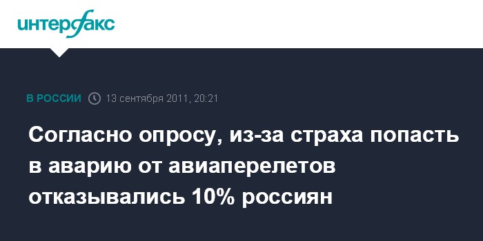 Согласно опросу компании, ситуации, когда им приходилось отказываться от авиаперелётов из-за страха ЧП, взрыва или аварии, возникали у 10% россиян: "На самолётах российских авиакомпаний просто боюсь летать – они валятся, как мухи в жаркий день"; "Это не фобия, но в последнее время я предпочитаю не летать на самолётах. Не верю в их надёжность"; "Постоянно! Езжу только поездами, уже лет пять! Полечу только на "Боинге" или «Эйрбасе", а наш авиапарк ужасен!"