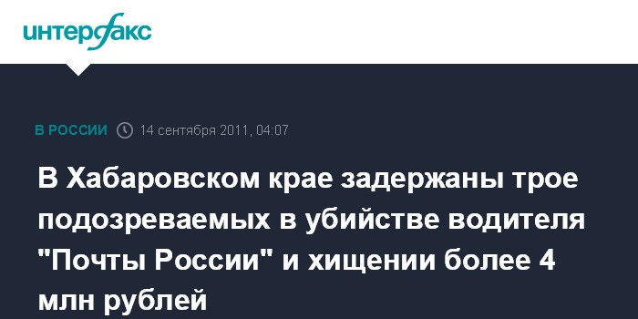 Хабаровск. 14 сентября. ИНТЕРФАКС-ДАЛЬНИЙ ВОСТОК - Сотрудники правоохранительных органов задержали в Хабаровском крае троих мужчин, подозреваемых в разбойном нападении на водителя автомобиля "Почты России" и хищении 4,2 млн рублей.