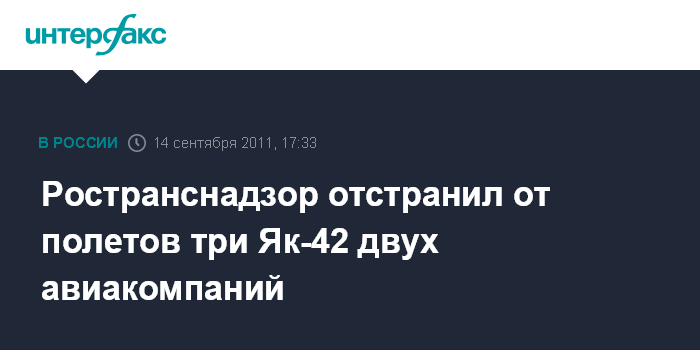 Москва. 14 сентября. INTERFAX.RU - Ространснадзор приостановил полеты трех Як-42 из-за выявленных нарушений.