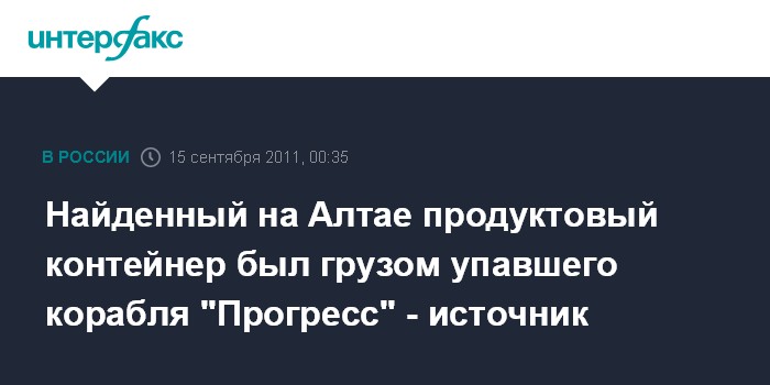Москва. 15 сентября. ИНТЕРФАКС-АВН - Контейнер с рационами питания для космонавтов, обнаруженный в среду в ходе поисков в Республике Алтай, находился в списке грузов корабля "Прогресс М-12М", не выведенного на орбиту из-за аварии ракеты-носителя "Союз-У", сообщил "Интерфаксу-АВН" источник в ракетно-космической отрасли.