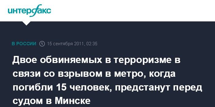 Минск. 15 сентября. ИНТЕРФАКС-ЗАПАД - Судебный процесс по уголовному делу о теракте на станции "Октябрьская" минского метрополитена начинается в четверг в Доме правосудия в белорусской столице.