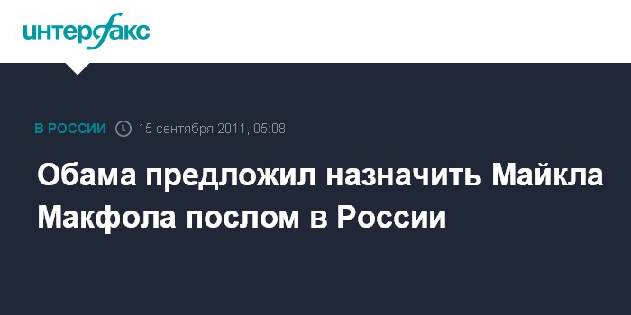 Лондон. 15 сентября. ИНТЕРФАКС - Президент США Барак Обама внес на рассмотрение конгресса кандидатуру Майкла Макфола для утверждения на должность посла в России.