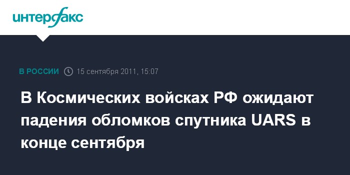 Москва. 15 сентября. INTERFAX.RU - Неконтролируемое падение обломков американского космического аппарата UARS ожидается в конце сентября в акватории Тихого океана, сообщил "Интерфаксу-АВН" в четверг официальный представитель управления пресс-службы и информации Минобороны РФ по Космическим войскам полковник Алексей Золотухин.