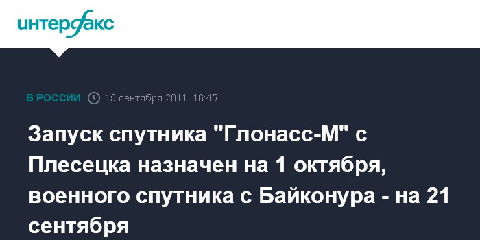 "Решением государственной комиссии 1 октября 2011 года планируется осуществить запуск космического аппарата "Глонасс-М" ракетой-носителем "Союз-2.1Б" с космодрома "Плесецк". 21 сентября 2011 года с космодрома "Байконур" планируется осуществить запуск космического аппарата военного назначения ракетой-носителем "Протон-М", - сказал он.
