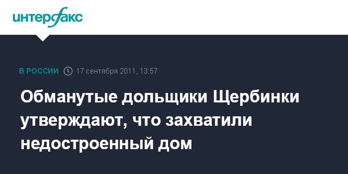 Москва. 17 сентября. ИНТЕРФАКС - Обманутые дольщики в субботу проникли в недостроенный объект в подмосковной Щербинке и расположились в одной из квартир, сообщил координатор движения "Однодольщики" Игорь Гульев. "Дольщикам удалось захватить недостроенный дом по улице Овражная в Щербинке. Сейчас в одной из квартир дольщики обустраивают штаб", - сказал И.Гульев "Интерфаксу".