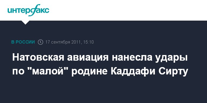 Брюссель. 17 сентября. INTERFAX.RU - Натовская авиация продолжает наносить удары по военным целям в Ливии. Как сообщает коммюнике военного командования НАТО, за сутки 16 сентября совершен 121 самолетовылет, в том числе 43 с целью нанесения ударов.