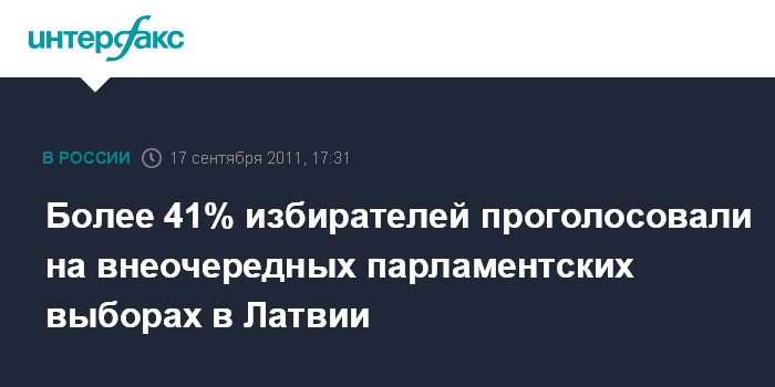 Рига. 17 сентября. INTERFAX.RU/BNS - Более 600 тысяч граждан Латвии приняли участие в голосовании на выборах в парламент страны, сообщает в субботу Центральная избирательная комиссия. К 16:00 мск проголосовали 41,13 % избирателей (613623 человек), сообщается на сайте ЦИК Латвии.