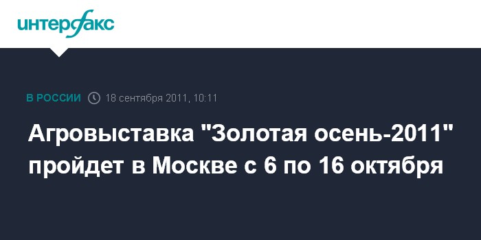 Москва. 18 сентября. INTERFAX.RU - XIII Российская агропромышленная выставка "Золотая осень-2011" пройдет в Москве с 6 по 16 октября на территории ВВЦ.