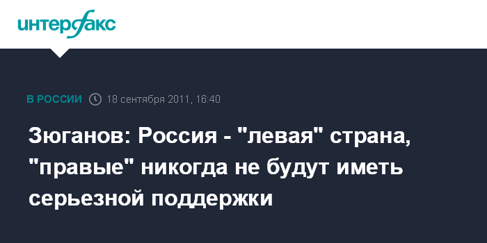 Он считает, что в России может победить только левая политическая идеология, носителем которой и является КПРФ. "Россия - левая страна по своей истории, культуре, по мироощущению. Не случайно мы строили новый мир, так сказать, царство Божие на земле", - сказал лидер российских коммунистов.