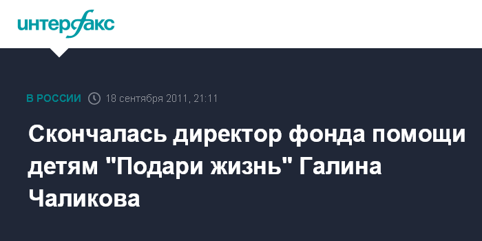 Москва. 18 сентября. INTERFAX.RU - Директор фонда "Подари жизнь" Галина Чаликова скончалась в ночь на воскресенье, сообщает официальный сайт фонда.