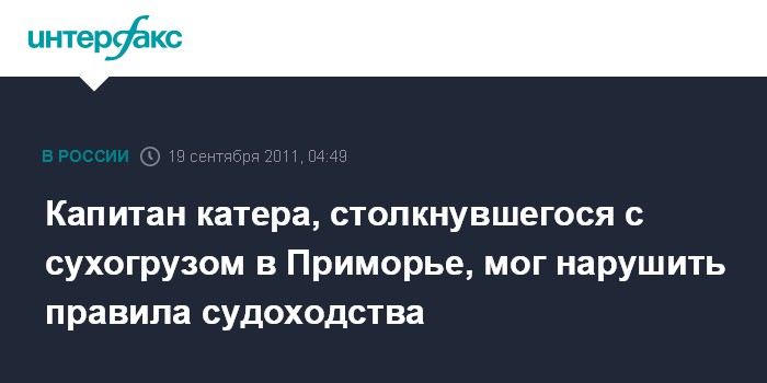 Владивосток. 19 сентября. ИНТЕРФАКС-ДАЛЬНИЙ ВОСТОК - Причиной столкновения в Амурском заливе в акватории порта "Владивосток" частного прогулочного катера с морским сухогрузом "Юникс", принадлежащим ЗАО "Гидрострой", могло быть нарушение капитаном прогулочного катера правил судоходства.