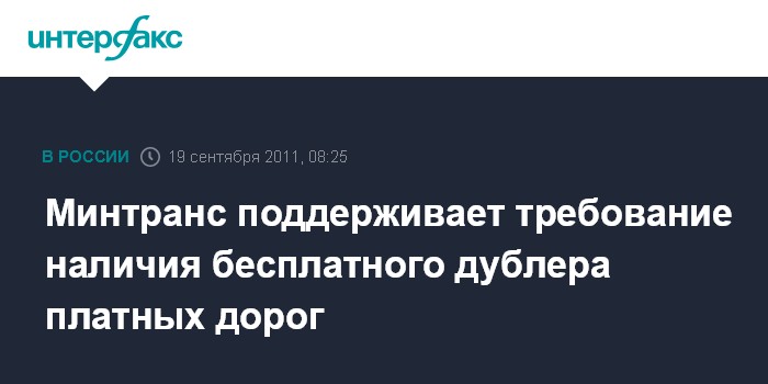 Министр напомнил, что в России законодательно закреплена необходимость наличия бесплатной альтернативной дороги. "В РФ законодательно обеспечено право тех, кто пользуется автомобильным транспортом, иметь альтернативу (бесплатную - ИФ)", - сказал И.Левитин.