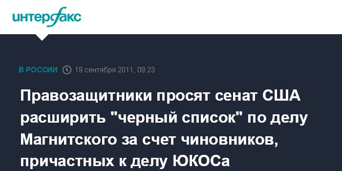 Москва. 19 сентября. INTERFAX.RU - Российские правозащитники и деятели культуры обратились в сенат США с просьбой применить аналогичные делу Сергея Магнитского санкции к российским чиновникам, причастным к делу ЮКОСа, в составленном оппозиционерами черном списке - 305 человек, пишет "Коммерсант" в понедельник.