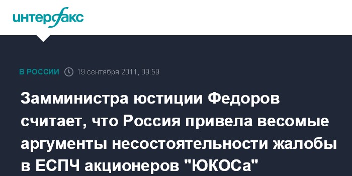 Москва. 17 сентября. INTERFAX.RU - Россия привела веские аргументы несостоятельности жалобы в ЕСПЧ акционеров "ЮКОСа", обвинивших власти РФ в захвате компании, сообщил руководитель аппарата Уполномоченного РФ при ЕСПЧ - заместителя министра юстиции РФ Андрей Федоров.