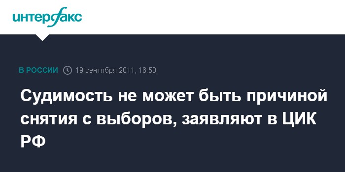 Москва. 19 сентября. INTERFAX.RU - ЦИК РФ заявил, что наличие судимости не является основанием для исключения кандидата в депутаты Госдумы из избирательного списка партии.