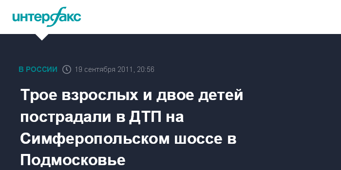 Москва. 19 сентября. INTERFAX.RU - Пять человек пострадали в ДТП на юге Московской области, сообщил "Интерфаксу" источник в правоохранительных органах.
