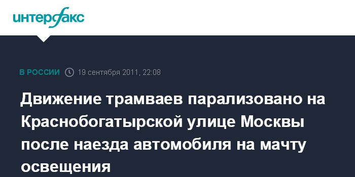 Москва. 19 сентября. INTERFAX.RU - Обрыв трамвайных проводов произошел на востоке Москвы после столкновения автомобиля с мачтой городского освещения, сообщил "Интерфаксу" источник в правоохранительных органах.