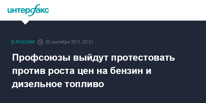 Москва. 20 сентября. ИНТЕРФАКС - Профсоюзы проведут во вторник всероссийскую акцию против роста цен на бензин и дизельное топливо, сообщают в Федерации независимых профсоюзов России (ФНПР).