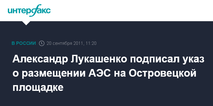 Минск. 20 сентября. INTERFAX.RU - Президент Белоруссии Александр Лукашенко подписал указ, в соответствии с которым Островецкая площадка (Гродненская область) определена для размещения белорусской атомной электростанции.