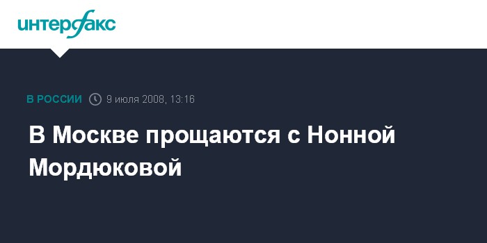 Москва. 9 июля. INTERFAX.RU – Народную артистку СССР Нонну Мордюкову, скончавшуюся в минувшее воскресенье на 83-м году жизни, сегодня похоронят в Москве на Кунцевском кладбище. Как сообщает телеканал "Вести 24", отпевание покойной началось в 12:00 в Храме Спаса Нерукотворного на Сетуни (Рябиновая улица, 18).