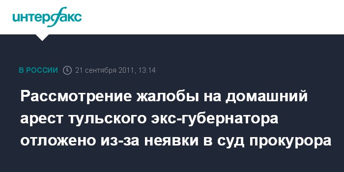 Москва. 21 сентября. INTERFAX.RU - Прокурор не явился на заседание Мосгорсуда, на котором планировалось рассмотреть жалобу защиты на домашний арест экс-губернатора Тульской области Вячеслава Дудки, обвиняемого в получении взятки в размере 40 млн рублей.
