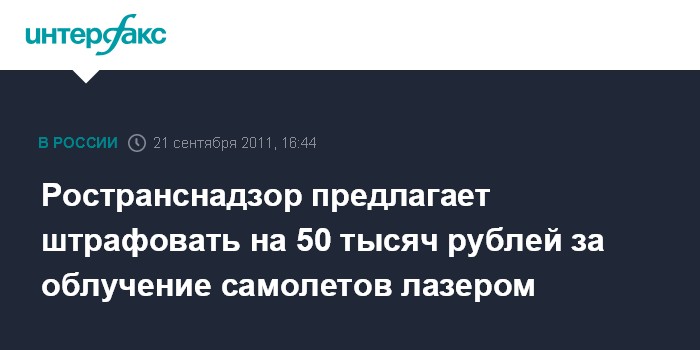 Москва. 21 сентября. INTERFAX.RU - Ространснадзор предлагает штрафовать за применение лазеров в направлении воздушных судов на 50 тыс. рублей или назначать административный арест на срок до 15 суток, говорится в сообщении ведомства.
