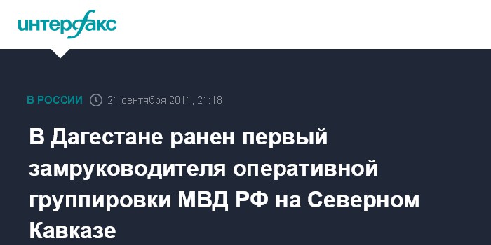 Ростов-на-Дону. 21 сентября. INTERFAX.RU - Полковник полиции, занимающий должность первого руководителя временной оперативной группировки МВД России в Северокавказском регионе, ранен при обстреле колонны в Дагестане, сообщил агентству "Интерфакс-Юг" источник в правоохранительных органах республики.