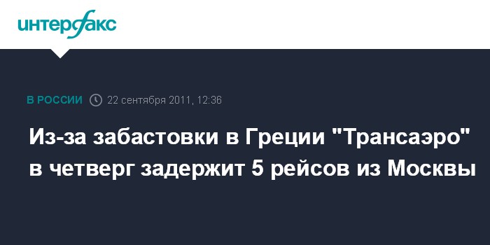 Москва. 22 сентября. INTERFAX.RU - Из-за транспортной забастовки в Греции ОАО "Авиакомпания "Трансаэро" задержит 5 рейсов из Москвы, сообщили "Интерфаксу" в пресс-службе компании.