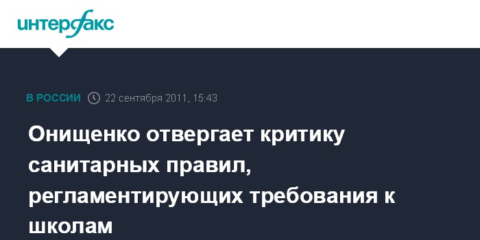 Москва. 22 сентября. INTERFAX.RU - Руководитель Роспотребнадзора, главный государственный санитарный врач РФ Геннадий Онищенко считает безосновательной критику со стороны депутата-справедливоросса Елены Мизулиной в адрес санитарных правил, которые регламентируют требования к условиям и организации обучения в школах. Санитарные правила вступили в силу 1 сентября.