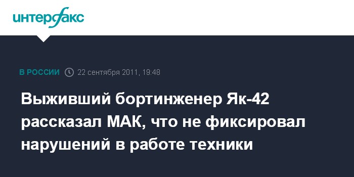 Москва. 22 сентября. INTERFAX.RU - Специалисты Межгосударственного авиационного комитета, расследующие катастрофу самолета Як-42 под Ярославлем, опросили бортинженера Александра Сизова.