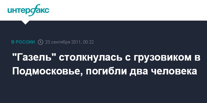 Москва. 23 сентября. ИНТЕРФАКС - Два человека погибли в ДТП вечером в четверг на северо-востоке Московской области, сообщил "Интерфаксу" источник в правоохранительных органах.