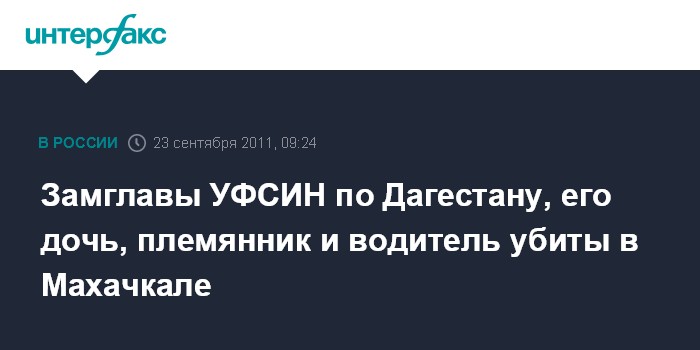 Махачкала. 23 сентября. INTERFAX.RU - Заместитель руководителя УФСИН по Дагестану, полковник внутренней службы Муртузалиев убит в пятницу утром в пригороде Махачкалы, вместе с ним погибли его дочь, племянник и водитель, сообщил "Интерфаксу" представитель СК РФ по республике.