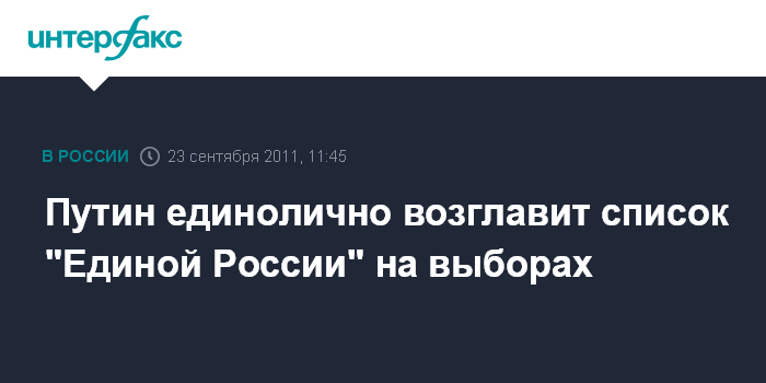 Москва. 23 сентября. INTERFAX.RU - На парламентские выборы, намеченные на 4 декабря, как ожидается, партию "Единая Россия" поведет ее лидер Владимир Путин - он возглавит список кандидатов в депутаты от партии на предстоящих выборах, сообщил "Интерфаксу" в пятницу источник в руководстве "Единой России".
