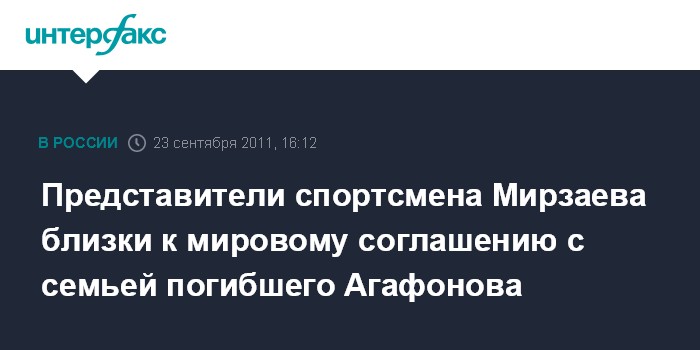 Москва. 23 сентября. INTERFAX.RU - Семья 19-летнего Ивана Агафонова, погибшего после удара чемпиона мира по самбо Расула Мирзаева, достигла предварительных договоренностей о мировом соглашении с представителями спортсмена.