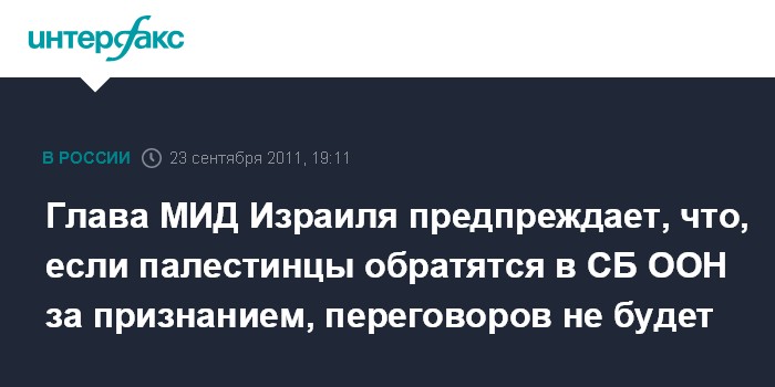Нью-Йорк. 23 сентября. INTERFAX.RU - Обращение Палестины в Совет Безопасности за полноправным членством будет означать конец палестино-израильских переговоров, считает глава МИД Израиля Авигдор Либерман.