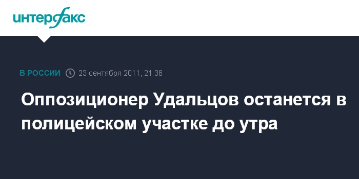 Москва. 23 сентября. INTERFAX.RU - Координатор "Левого фронта" Сергей Удальцов, задержанный в пятницу неподалеку от Гостиного двора в Москве, где проходил съезд "Единой России", оставлен в ОВД "Тверское" до утра субботы, сообщили "Интерфаксу" в пресс-службе оппозиционного движения.
