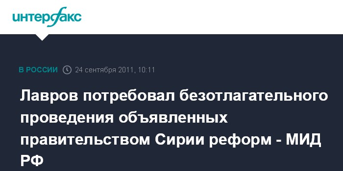 Москва. 24 сентября. INTERFAX.RU - Министр иностранных дел РФ Сергей Лавров на встрече глав МИД государств БРИКС, состоявшейся 23 сентября в Нью-Йорке, призвал Дамаск немедленно приступить к обещанным реформам, чтобы успокоить население Сирии.