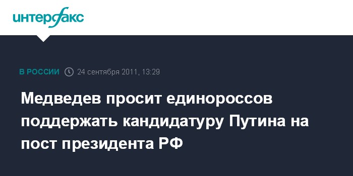 Москва. 24 сентября. INTERFAX.RU - Президент РФ Дмитрий Медведев предложил "Единой России" поддержать кандидатуру премьер-министра страны Владимира Путина в качестве будущего президента России. "Я считаю, что было бы правильно, чтобы съезд поддержал кандидатуру председателя партии Владимира Путина на должность президента страны", - заявил Д.Медведев на съезде партии.