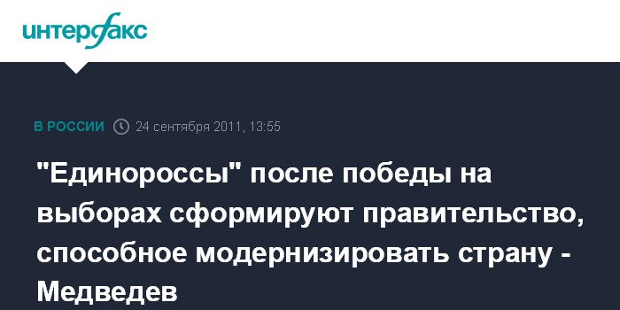 "Я считаю сегодня правильным уделить внимание именно практическому курсу на модернизацию нашей жизни. Этим должно заниматься кардинально обновленное правительство России, которое будет формировать партия-победитель, и я уверен, что это будет "Единая Россия", - заявил Д.Медведев, выступая на съезде партии.
