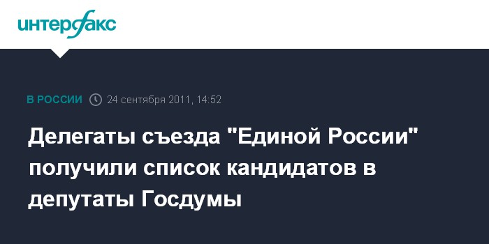 Москва. 24 сентября. INTERFAX.RU - Делегаты съезда "Единой России" получили список кандидатов в депутаты Госдумы от партии, общефедеральная часть которого состоит лишь из одного номера - имя Дмитрия Медведева, согласившегося возглавить данный список, в нем пока не присутствует. Как передает корреспондент "Интерфакса", имя лидера партии, председателя правительства Владимира Путина в этом списке отсутствует.