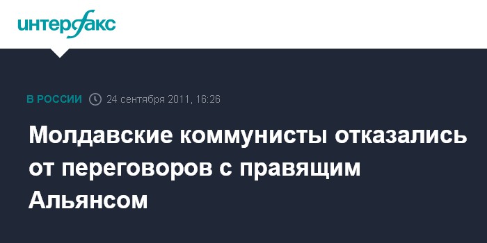 Кишинев. 24 сентября. INTERFAX.RU - Оппозиционная в Молдавии Партия коммунистов (ПКРМ) отвергла предложение правящего Альянса за европейскую интеграцию о переговорах с ним по преодолению политического кризиса, из которого в стране два года не могут избрать президента. Как сообщили "Интерфакс" источники в руководстве ПКРМ, на пленуме партии в субботу принято заявление, в котором партия отказала Альянсу в таких переговорах.